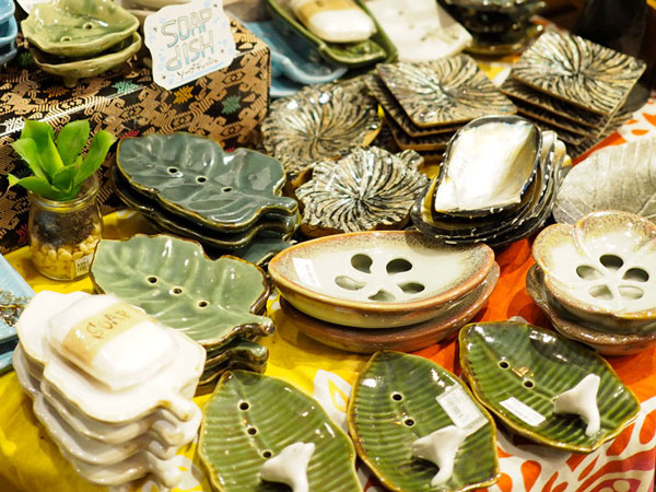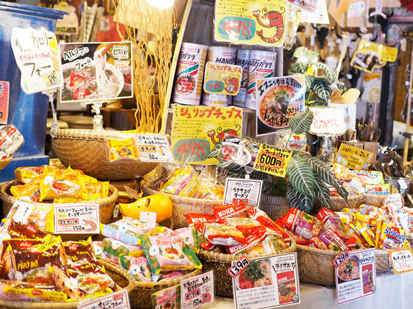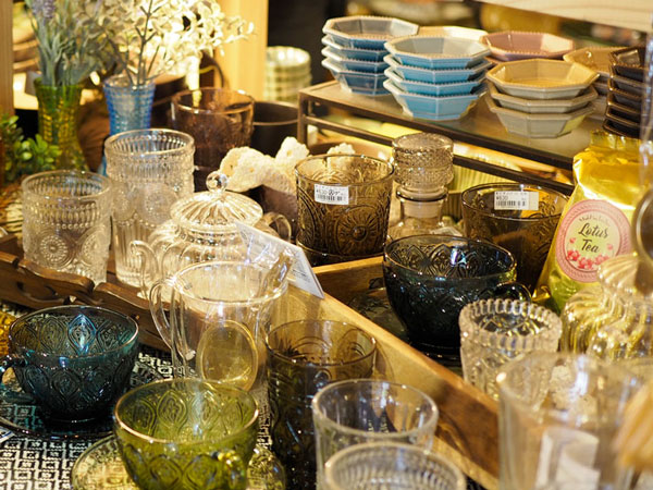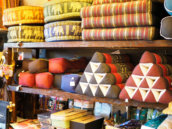 敷地内のちょうど中央にあるのがメコンショップです。 タイで人気の衣類や、ポーチ、バッグ類、そしてキラキラと輝く小物たちがたくさん並ぶメコンショップ。 グラスや器、タイ料理屋さんでお馴染みのアルミ食器も豊富なので、ここでしか買えない食器をぜひ見つけてみてください。 お子さま向けのおもちゃもたくさんあるので、お子さまへのお土産にもおすすめの物がたくさんありますよ。